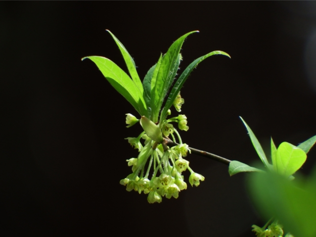 雌雄異株。花は黄緑色で、春に葉が出るのと同じ頃、葉脇から出た散形花序に咲き、雄花には9本の雄蕊、雌花には子房がある。