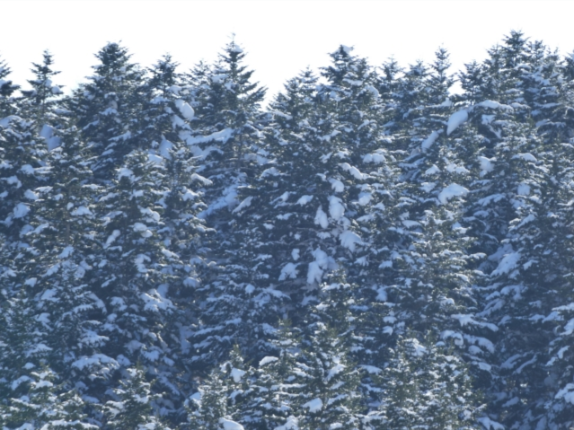 北海道の森に育つ樹木の中でも数が多く、海の近くから標高1000mを超える高山まで生えています。トドマツは、1年中葉は緑色で葉を落とさず、冬は枝先に雪をのせて、立っています。